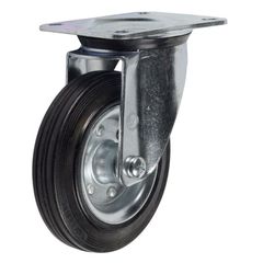 Колесные опоры промышленные усиленные поворотные, обод - прессованный из листовой стали, оцинкован, шинка из полуэластичной черной резины, платформенное крепление, толщина металла кронштейна для диаметров колес 160 и 200 мм - 4,5 мм, роликоподшипник