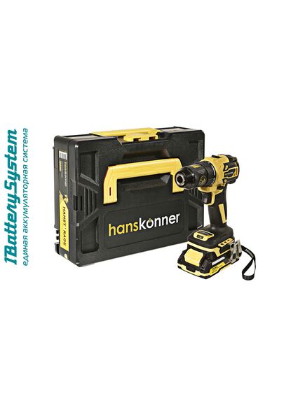 Hanskonner HCD2065BLС – аккумуляторный 18 В, двухскоростной шуруповерт – является частью системы 1BatterySystem, обеспечивающей совместимость одного и того же аккумулятора с целым рядом наименований инструмента. Модель обладает максимально сбалансированной компоновкой: небольшая толщина корпуса и рукояти позволяют эффективное использование в условиях с затрудненным доступом, а нейтральный центр тяжести, и обилие прорезиненных противоскользящих поверхностей способствуют надежному хвату, и лучшему контролю в процессе работы. Шуруповерт оснащен 18 В бесщеточным двигателем, характеризующимся на 30% лучшей производительностью в сравнении с коллекторными аналогами. Кроме того, бесщеточный двигатель отлично справляется с кратковременными перегрузками и не склонен к перегреву. Благодаря применению мощного планетарного механизма High Torque Technology, Hanskonner HCD2065BLС обладает высоким показателем максимального крутящего момента, достигающего 65 Н м. Имеет две скорости: режим пониженных оборотов (0 – 450 об/мин) предназначен для работ с крепежом, режим повышенных оборотов (0 – 1650 об/мин) – для сверления отверстий в различных материалах. Наличие 20-ти ступенчатой муфты регулировки усилия позволяет производить максимально гибкую настройку необходимого момента затяжки. Усиленный цельнометаллический патрон c муфтой ClickLock и максимальным диаметром захвата 13 мм обеспечивает надежность фиксации, и расширяет набор применяемой оснастки для выполнения работ с повышенной нагрузкой. Предусмотрена функция блокировки вала, способствующая удобству смены оснастки одной рукой. К особенностям Hanskonner HCD2065BLC стоит отнести электронный тормоз выбега двигателя, гарантирующий мгновенную остановку патрона, эффективную LED-подсветку рабочей зоны WorkingLight с блоком коллиматорных линз, создающих направленный симметричный луч, а также индикатор остаточного заряда аккумулятора PowerCheck. Дополнительному комфорту использования способствуют специальная зацепная скоба крепления на пояс и страховочный ремешок на руку. Шуруповерт штатно комплектуется парой литий-ионных (Li-ion) аккумуляторов емкостью 2.0 А ч с возможностью подзарядки от них через USB выход сторонних гаджетов, импульсным зарядным устройством с функцией быстрой зарядки (0 – 100% – 50 мин), USB LED-фонарем, запитываемым от АКБ, двухсторонней битой. Прочный кейс единой системы хранения инструмента HANSTORAGE гарантирует сохранность устройства и аксессуаров в процессе транспортировки.