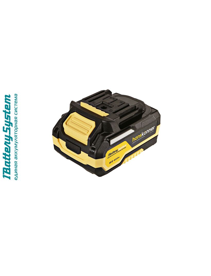 18-вольтовый аккумулятор HBP2004 Hanskonner емкостью 4.0 Ач обеспечивает впечатляющую мощность и совместим с любым инструментом единой аккумуляторной системы 1BatterySystem.