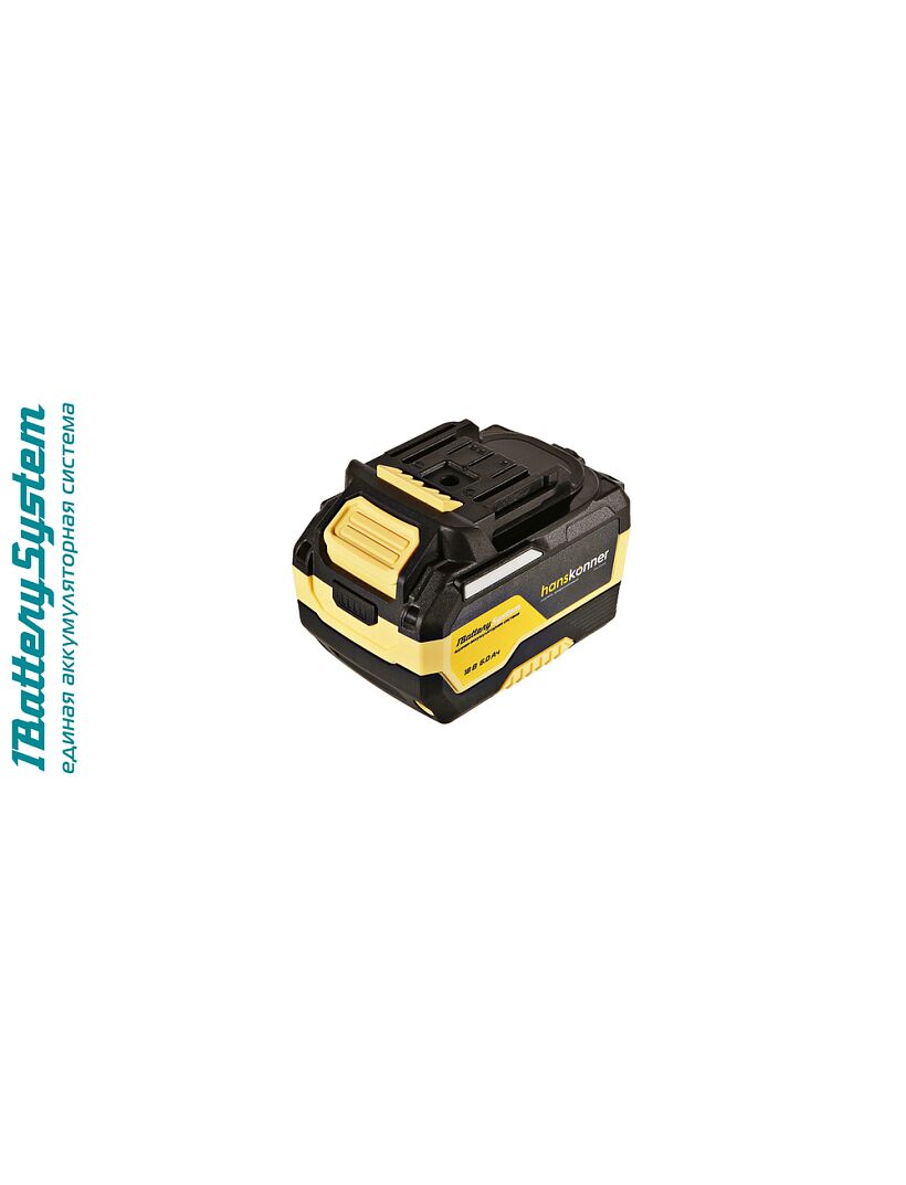 18-вольтовый аккумулятор HBP2006 Hanskonner емкостью 6.0 Ач обеспечивает впечатляющую мощность и совместим с любым инструментом единой аккумуляторной системы 1BatterySystem.