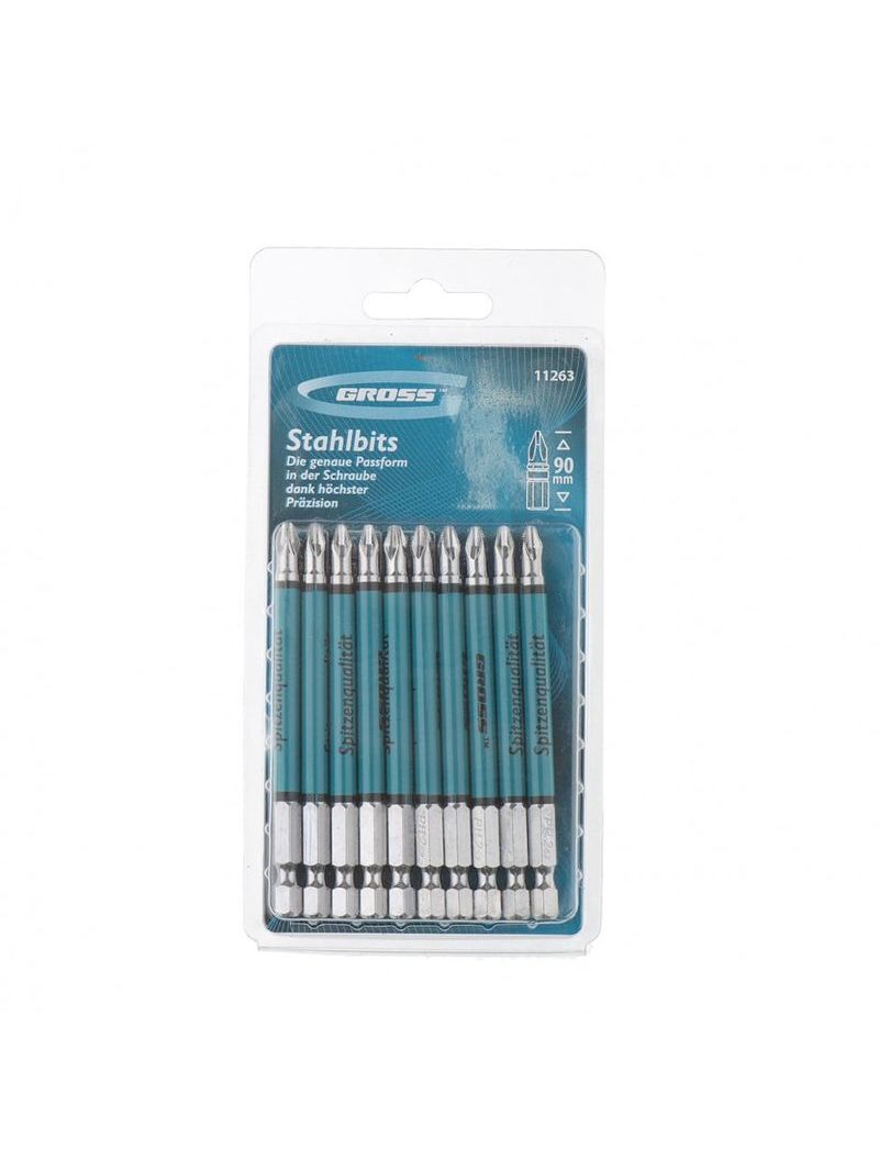 Набор бит GROSS 11263 предназначен для использования в качестве насадок в электроинструменте. Изготовлены биты из высококачественной инструментальной стали марки S2. Твердость бит составляет 58-62 HRС.Основу биты составляет шестигранный хвостовик размером 0,6 см (1/4 дюйма). Длина биты 90 мм, тип шлица — PH2 (крестообразный). Набор из десяти бит упакован в жесткую термоформованную пленочную коробку (double blister).