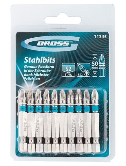 Набор бит GROSS 11345 предназначен для использования в качестве насадок в ручном и механическом инструменте. Изготовлены биты из высококачественной инструментальной стали марки S2. Твердость бит составляет 58-62 HRС.Основу биты составляет шестигранный хвостовик размером 0,6 см (1/4 дюйма). Длина биты 50 мм, тип шлица PZ2 (крестообразный с дополнительными направляющими).
