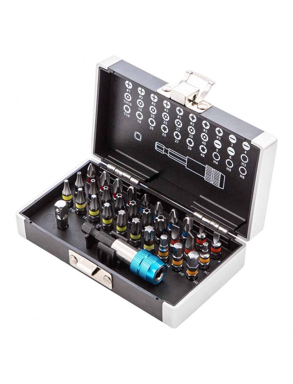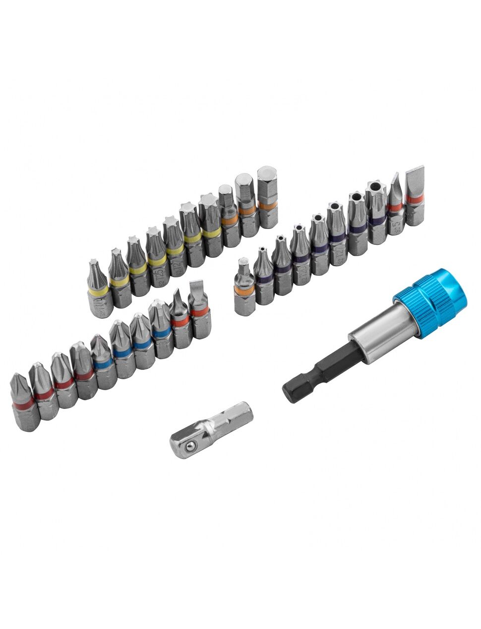 Широкая комплектация — одном наборе представлено 6 типов бит: PH и PZ калибров 1-3, SL калибров 3, 4, 5, 6, TORX и TORX Tamper (10, 15, 20, 25, 27, 30, 40), HEX 3-6. Самые ходовые размеры PH2 и PZ2 поставляются по 2 штуки.