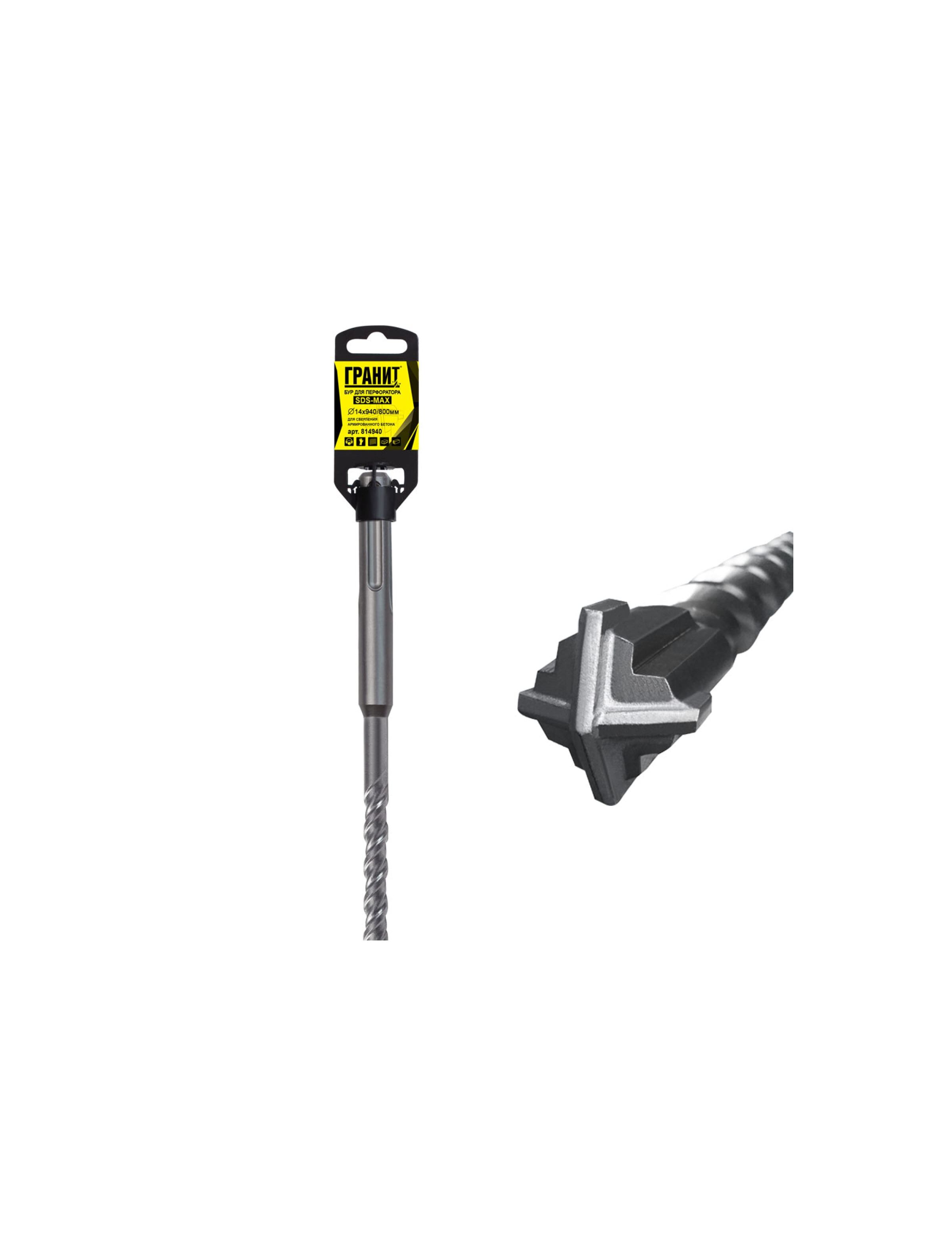 Бур SDS-Max ГРАНИТ 814940 используется в перфораторах и отбойных молотках с системой крепления SDS-max для ударно-вращательного сверления. Бур оснащен увеличенной головкой с 4-мя резцами, что обеспечивает высокую скорость прохождения сквозь материал и долгий срок службы. Особая форма спирали ускоряет удаление продуктов сверления, уменьшая нагрев инструмента. Деформация бура от ударных нагрузок исключена за счет усиленного стального стержня. Предназначен для работы по бетону, граниту, кирпичной кладке и твердым известнякам.
