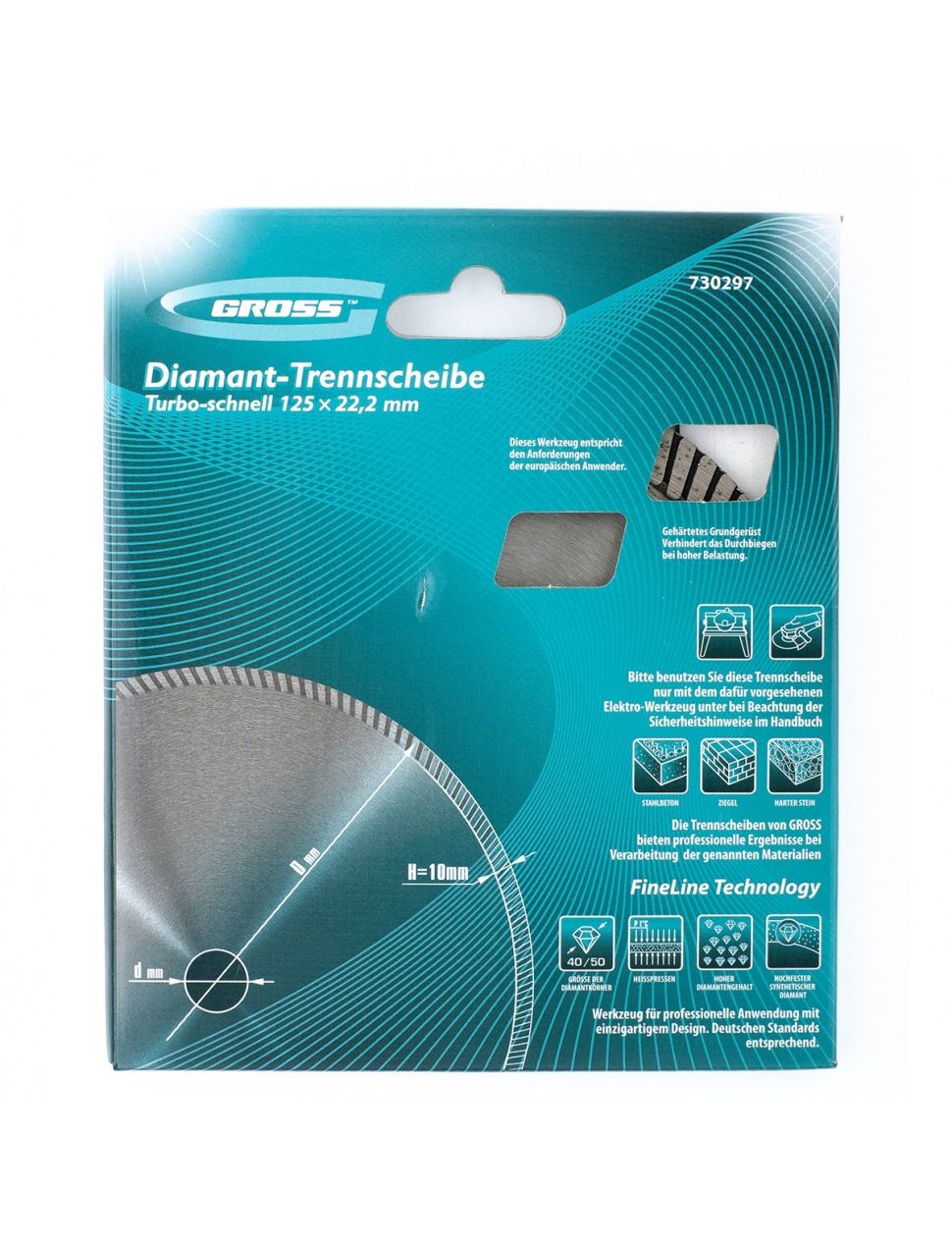 Диск алмазный отрезной турбо GROSS 730297 используется совместно с угловыми шлифовальными машинами для сухого реза армированного бетона, кирпича, природного камня. Режущие сегменты нанесены методом горячего прессования на стальное основание диска. Форма диска обеспечивает плавное резание с эффективным охлаждением.