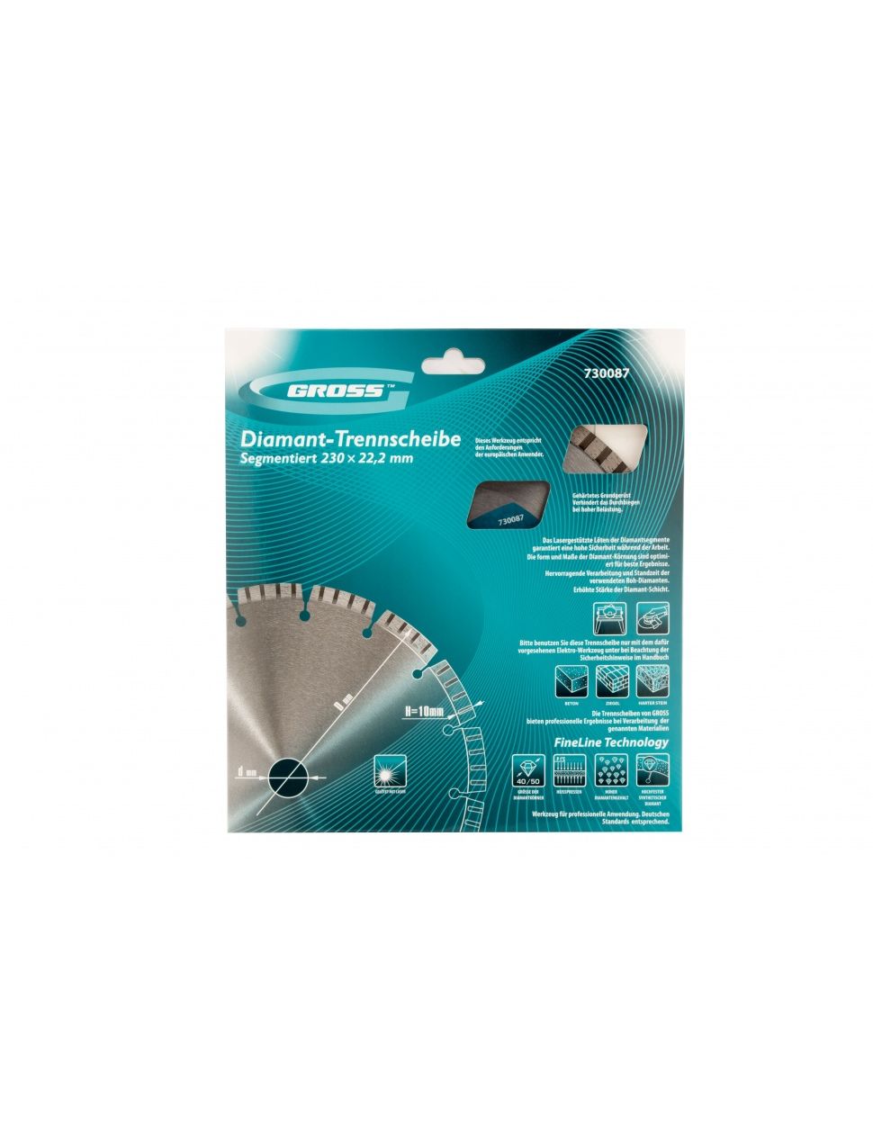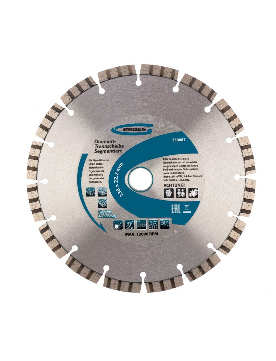 Диск алмазный отрезной GROSS 730087 используется совместно с угловыми шлифовальными машинами для сухого реза бетона, кирпича и природного камня. Режущие сегменты нанесены при помощи лазерной сварки на стальное основание диска. Форма диска обеспечивает высокую производительность и эффективное удаление шлама из зоны резания.