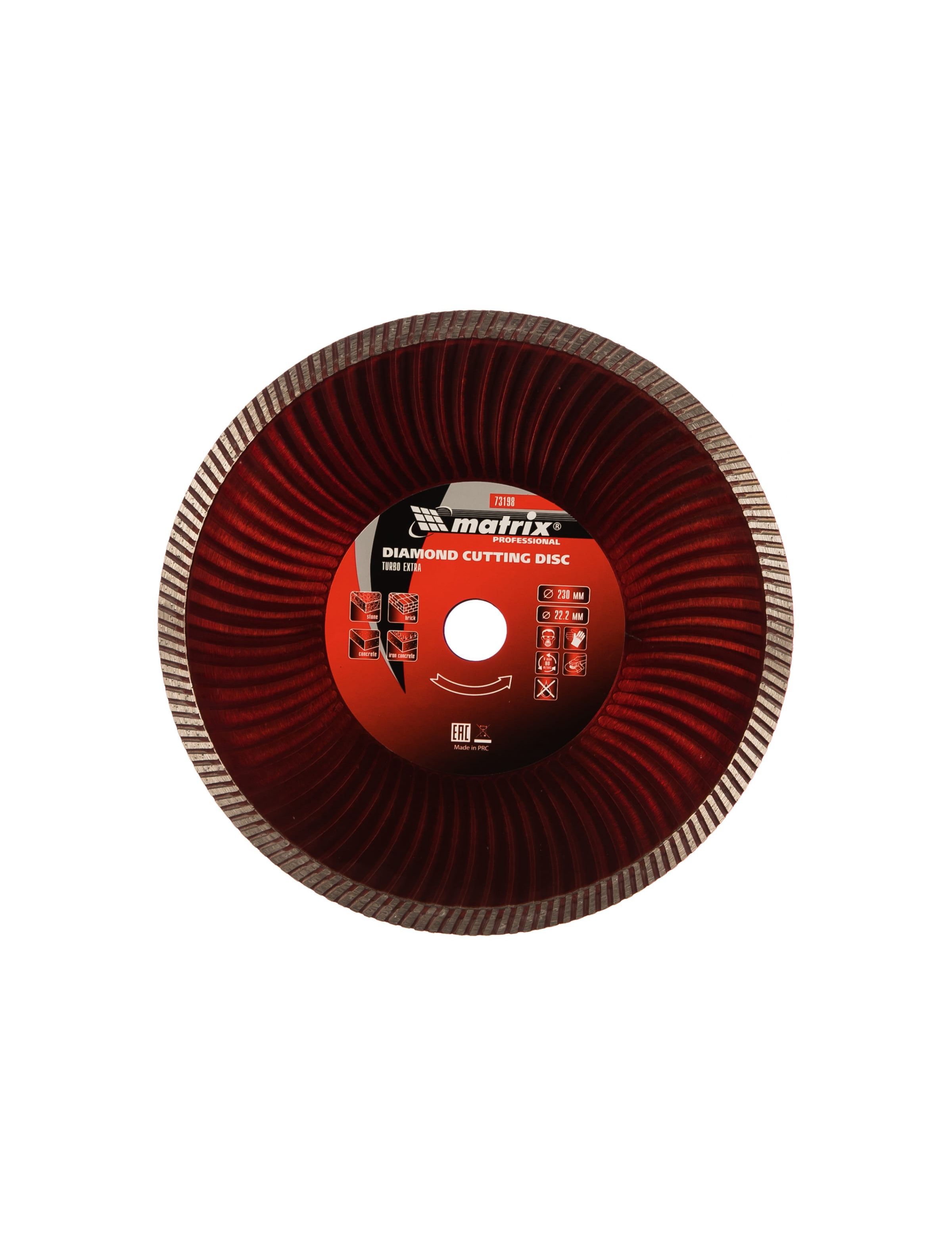 Алмазный отрезной диск Turbo Extra Matrix 73198 является сменным элементом для угловых шлифмашин. Предназначен для реза бетона, железобетона и мрамора. Волнообразная форма металлического основания способствует максимально быстрому удалению продуктов пиления, улучшенному охлаждению и снижению нагрузки на УШМ. Диск характеризуется повышенной концентрацией алмазов, улучшенным качеством алмазных зерен и оптимально подобранной металлической связкой. Диск предназначен для сухой резки.