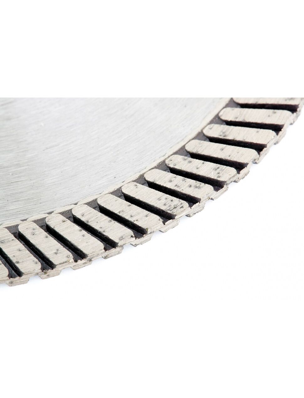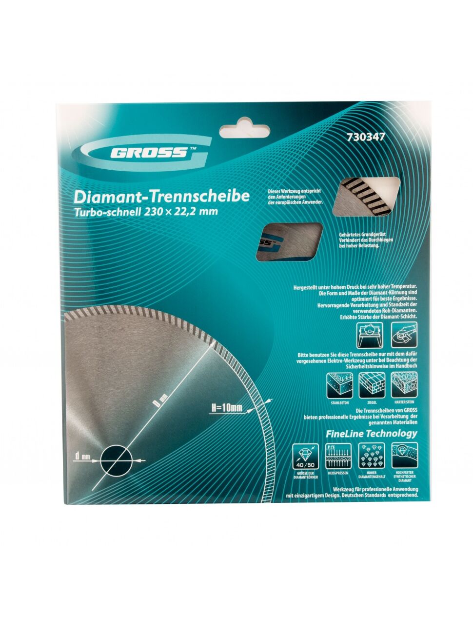 Диск алмазный отрезной турбо GROSS 730347 используется совместно с угловыми шлифовальными машинами для сухого реза армированного бетона, кирпича, природного камня. Режущие сегменты нанесены методом горячего прессования на стальное основание диска. Форма диска обеспечивает плавное резание с эффективным охлаждением.