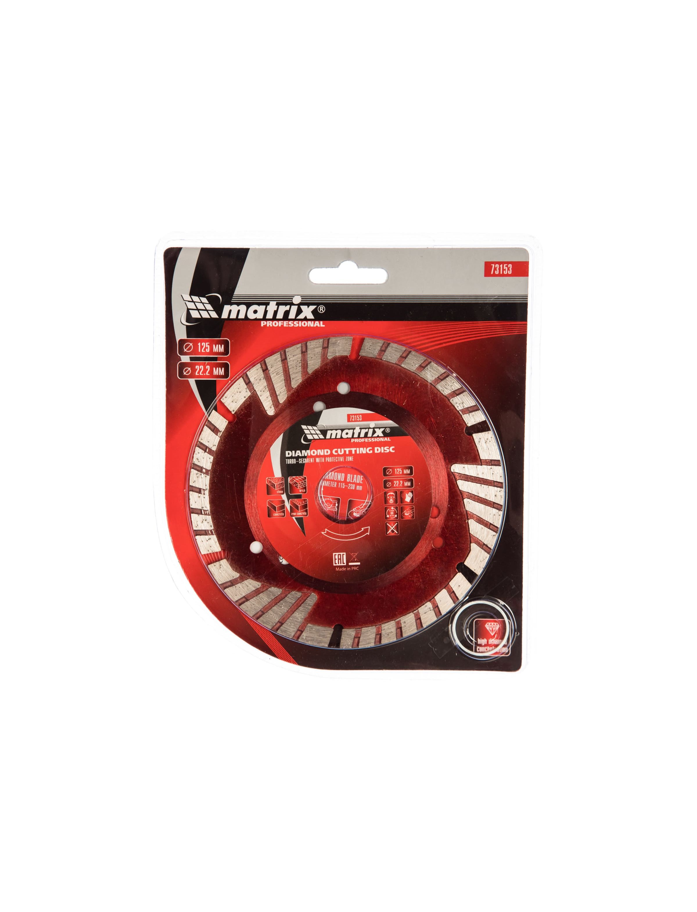 Диск алмазный отрезной сегментный Matrix 73153 с защитными секторами, 125 х 22,2 мм, применяется для сухой резки бетона разной прочности, камня, кирпича, шлакоблока и тротуарной плитки. Он используется как оснастка для углошлифовальных машин с соответствующим посадочным диаметром. Диск изготовлен методом холодного прессования и выдерживает повышенные нагрузки при прохождении арматуры в слабоармированном железобетоне.