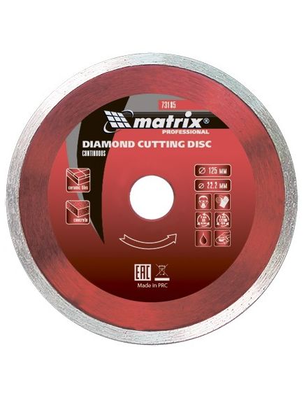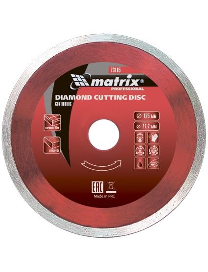 Диск алмазный отрезной сплошной Matrix 73186, 150 х 22,2 мм, предназначен для мокрого реза мрамора, керамической плитки, керамогранита, натурального или искусственного камня. Устанавливается на углошлифовальные машины и плиткорезы с посадочным диаметром 22,2 мм. Благодаря использованию водяного охлаждения улучшается качество реза, а также продлевается срок службы диска.