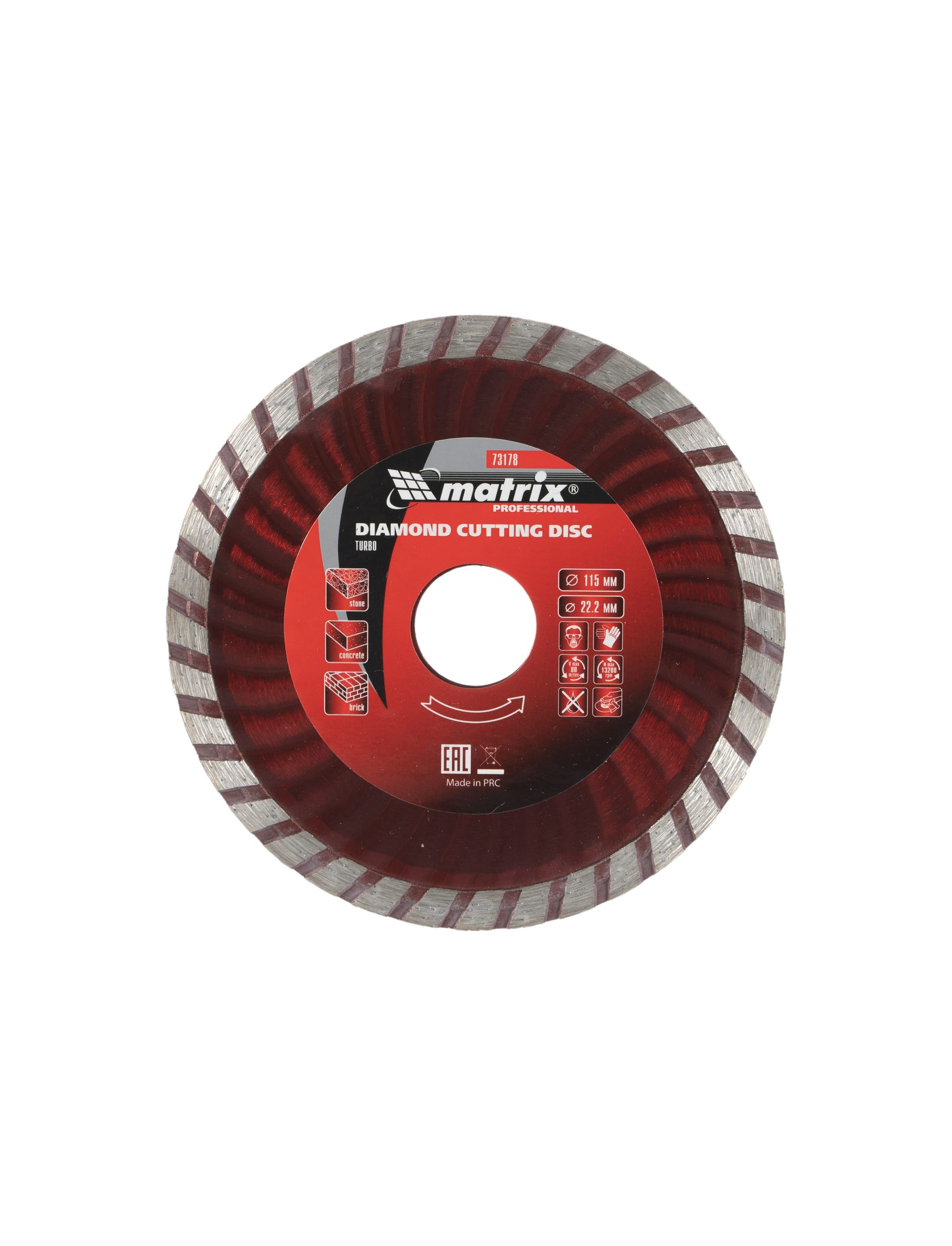 Диск алмазный отрезной Turbo Matrix 73178 является сменным элементом для угловых шлифовальных машин. Предназначен для реза бетона, кирпичной кладки и камня. Турбированная форма способствует максимально быстрому удалению продуктов пиления во время резки, улучшенному охлаждению и снижению нагрузки на УШМ. Диск предназначен для сухой резки.
