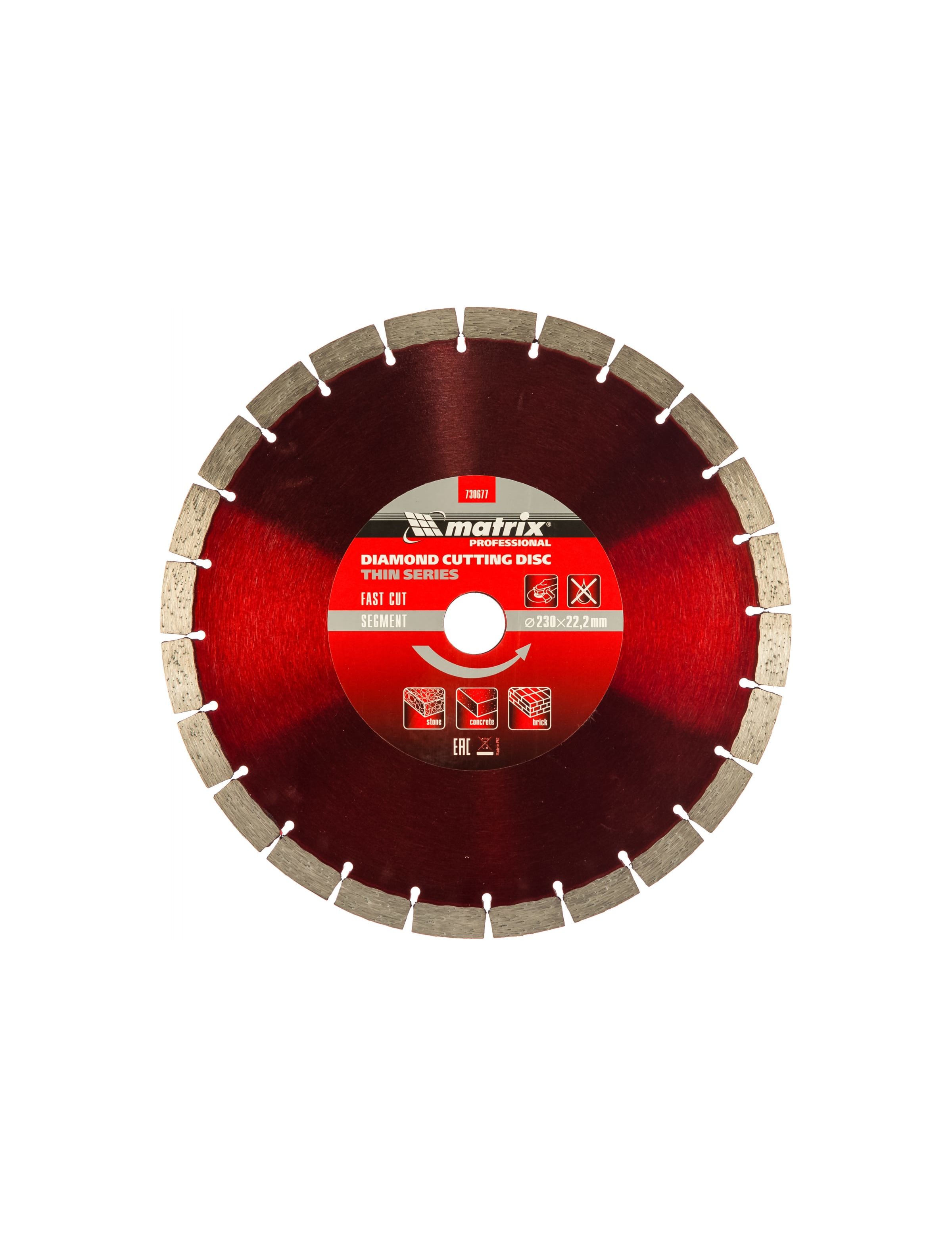 Отрезной сегментный алмазный диск Matrix 230х22,2 мм 730677, тонкий, позволяет проводить сухое резание свежего и старого бетона, камня, гранита, шлакоблока, тротуарной плитки, песчаника и кирпича с помощью УШМ. Его можно использовать как в частной мастерской, так и на стройке для решения профессиональных задач. Тонкий корпус диска способствует снижению нагрузки на инструмент, позволяя ускорить рабочий процесс на 20%.