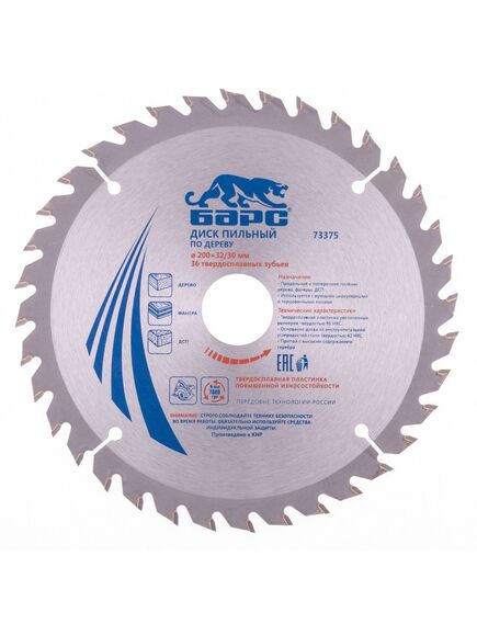 Пильный диск Барс 73375, 200 х 32 мм, с 36 зубьями и кольцом 32/30 мм предназначен для быстрого пиления древесины мягких и твердых пород, ДСП, МДФ и фанеры. Тип зубьев АТВ и оптимально подобранный угол зуба позволяют производить как продольный, так и поперечный распил. Диск используется совместно с торцовочными и циркулярными пилами с посадкой 32 мм. В комплект входит переходное кольцо на диаметр 30 мм, расширяющее возможности применения оснастки. Диск подходит для интенсивной эксплуатации и может использоваться в профессиональной сфере.