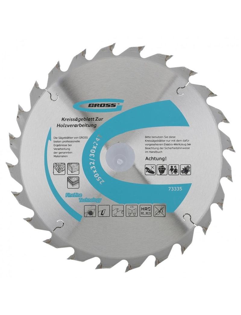 Пильный диск по дереву торговой марки GROSS предназначен для распиловки заготовок из мягких и твердых пород древесины, фанеры, ДСП. Изготовлен пильный диск из пружинной стали марки 65MN. Размеры диска 250 х 32 мм, с возможностью использовать переходник диаметром 30 мм. Форма зуба (ATB) с положительным углом наклона обеспечивает эффективную распиловку крупных заготовок. 24 режущие пластины изготовлены из твердого сплава, произведенного компанией CERATIZIT (Люксембург), и обладают исключительной стойкостью к окислению, истиранию и разрушению. Пайка пластины к диску осуществляется припоем с высоким содержанием серебра, гарантируя тем самым высокую надежность крепления.