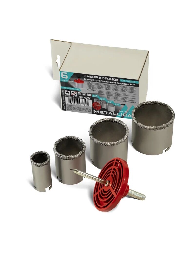 Набор коронок по плитке с твердосплавным зерном Metallica Optima 907290 предназначен для безударного сверления отверстий в мягкой облицовочной плитке, силикатном кирпиче, красном кирпиче низких марок, гипсовых перегородках, пено-газобетоне, пазогребневой плите дрелями и шуруповертами с кулачковым патроном. Применяется для сверления отверстий под электромонтажные коробки, а также при прокладке труб, шлангов, электропроводки и других коммуникаций.