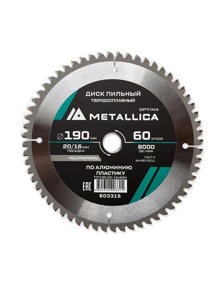 Диск пильный тв. сплав. 210x30/20/16 мм, 72 зуба,Т=2,6 мм Optima алю. пластик METALLICA 903346