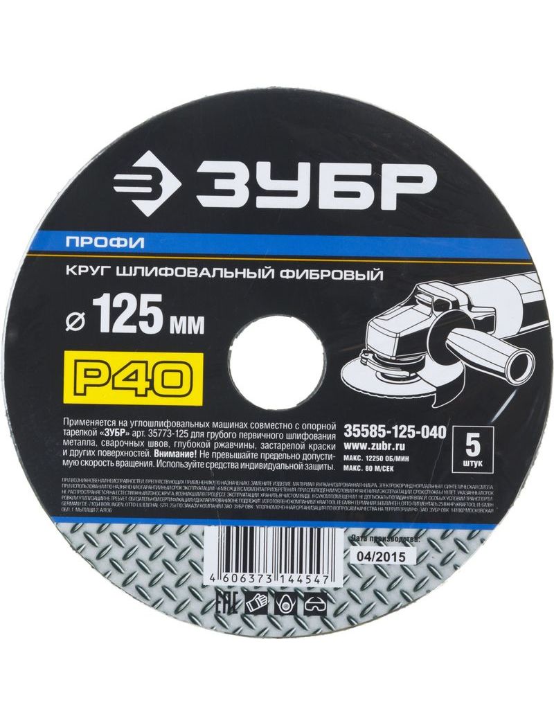 Шлифовальный фибровый диск ЗУБР 35585-125-040 является сменным элементом для угловых шлифовальных машин. Применяется совместно с опорной тарелкой. Предназначен для первичного грубого шлифования металла, сварочных швов, ржавчины, застарелой краски и других материалов. Нанесение абразивного материала — электростатическое. Прочная фибровая основа обладает повышенной гибкостью и стойкостью к разрыву. Вырубка круга осуществляется промышленным лазером, что обеспечивает сохранность рабочей формы и снижает эффект скручивания при длительном хранении. В упаковке – 5 шт.
