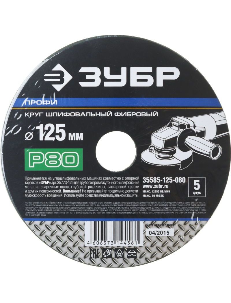 Диск шлифовальный фибровый 125 мм зернистость 80 (5 шт) ЗУБР 35585-125-080