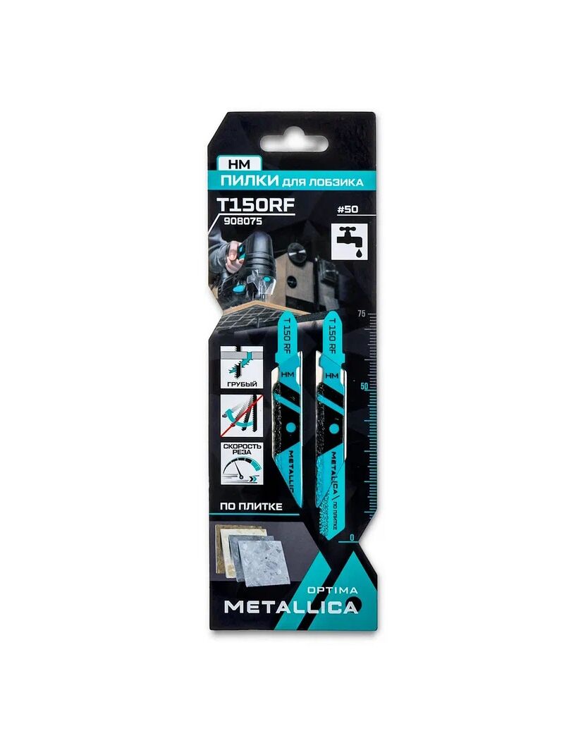 Пилки для лобзика Metallica Optima 908075, T150RF, 75/50мм, HM, твердосплавное зерно, прямой рез, по плитке 2шт. предназначены, в качестве вспомогательного инструмента, для пиления мягкой облицовочной глазурованной плитки, абразивных пластиков при производстве локальных работ. Ограниченно подходят для напольной плитки средней твердости.