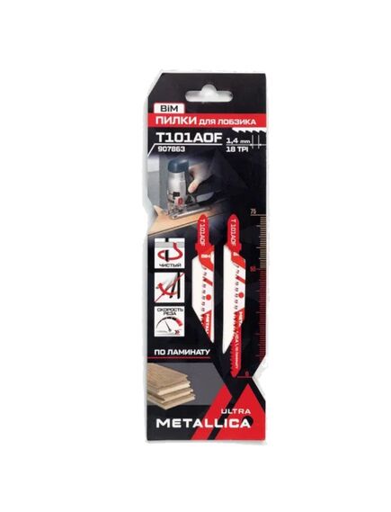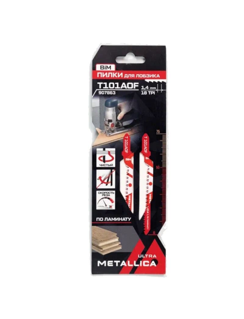 Пилки для лобзика Metallica Ultra 907863, T101AOF, 75/50мм, шаг 1,4мм, BiM, чистый рез, по ламинату, 2шт. предназначены для пиления ламината, ЛДСП мягкой и твердой древесины, фанеры, OSB, не хрупких пластиков.