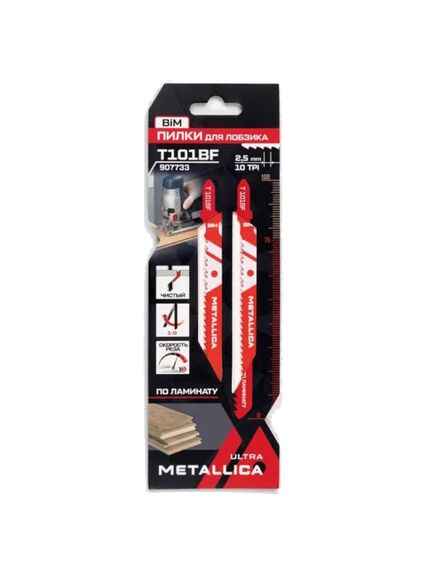 Пилки для лобзика Metallica Ultra 907733, T101BF, 100/75мм, шаг 2,5мм, BiM, чистый рез, по ламинату, 2шт. предназначены для пиления ламината, ЛДСП мягкой и твердой древесины, фанеры, OSB, не хрупких пластиков.