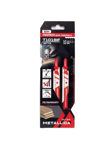 Пилки для лобзика Metallica Ultra 907719, T101BIF, 82/56мм, шаг 1,7мм, BiM, чистый рез, по ламинату, 2шт. предназначены для аккуратного пиления ламината, ЛДСП, мягкой и твердой древесины, фанеры, OSB не хрупких пластиков.