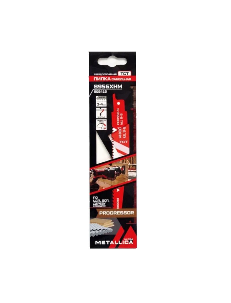 Пилка сабельная Metallica Ultra 908419 твердосплавная предназначена для пиления цементно-стружечных плит (ЦСП), шифера, ГВП, ГКЛ, опалубочной доски, дерева с гвоздями, ДСП, абразивных пластиков, пазогребневых плит, пакетов разных материалов. Ширина полотна 19 мм с сужением к окончанию для возможности криволинейного пиления. Скорость пиления средняя - ниже средней. Рекомендуемая частота хода шатуна сабельной пилы: для дерева - 3000 циклов/мин, для ЦСП, пазогребневой плиты - 2000-2500 циклов/мин, для пластиков 1000-1500 циклов/мин, без охлаждения.