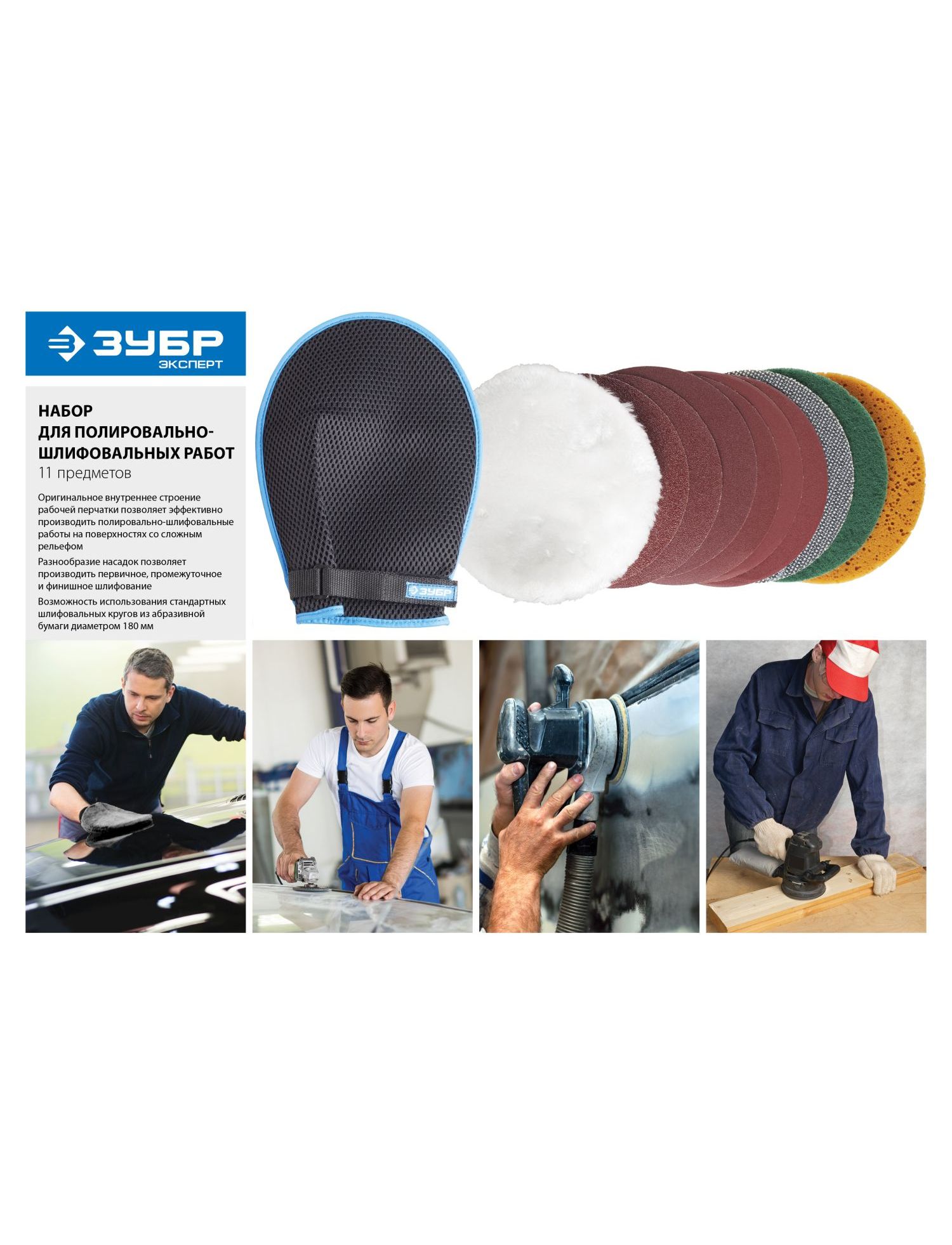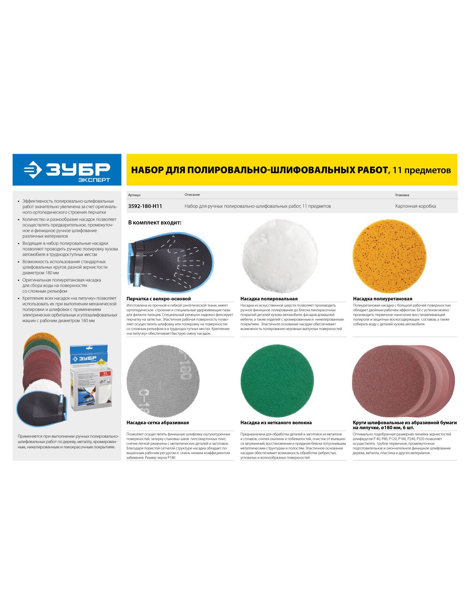 Набор ЗУБР 3592-180-H11 используется для предварительного, промежуточного, финишного шлифования и полирования заготовок из дерева и металла, а также лакокрасочных, хромированных и никелированных поверхностей. Включает в себя перчатку с ортопедическим строением и 10 насадок с креплением на липучку. Данный набор обеспечивает отличное качество и обладает большим рабочим ресурсом.