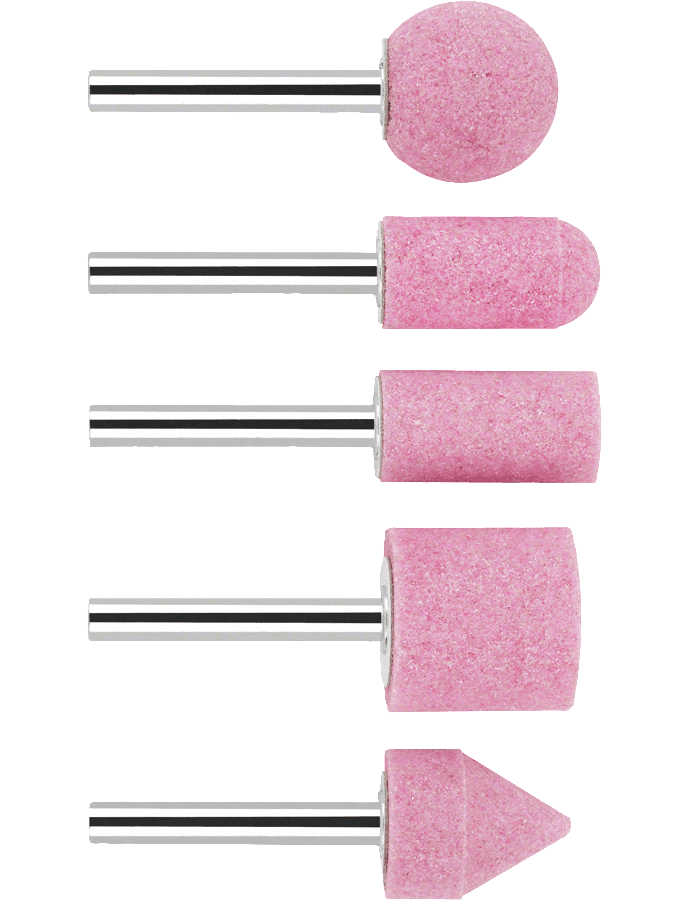 В наборе штифты: круглые, полукруглые, цилиндрические, дисковые, конусные. Диаметром от 15 до 25 мм. Зернистость – К 60.