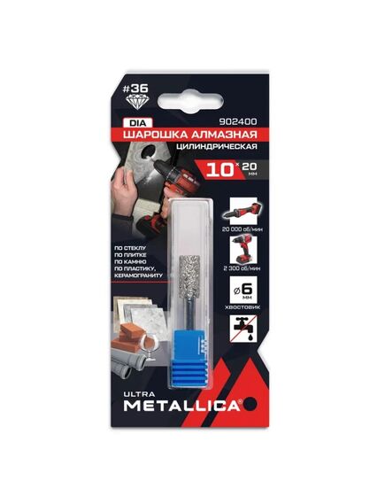 Шарошка алмазная цилиндр 10х20 мм, #36, L=60 мм, по граниту, бетону, плитке METALLICA 902400