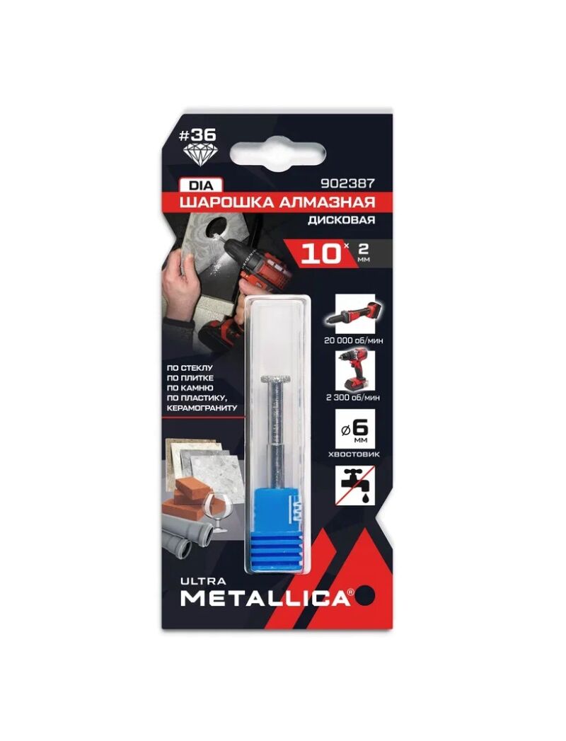 Шарошка алмазная Metallica Ultra 902387 дисковая предназначена для обработки керамогранита, облицовочной плитки, керамики, кирпича, искусственного и натурального камня, абразивных пластиков и других минеральных материалов с помощью прямой шлифмашины или дрели. Применяется для снятия фасок, закругления кромок, расширения отверстий, прорезания канавок. Идеальный вспомогательный инструмент, применяемый при подгонке и укладке плитки, работы с отверстиями и криволинейными поверхностями.