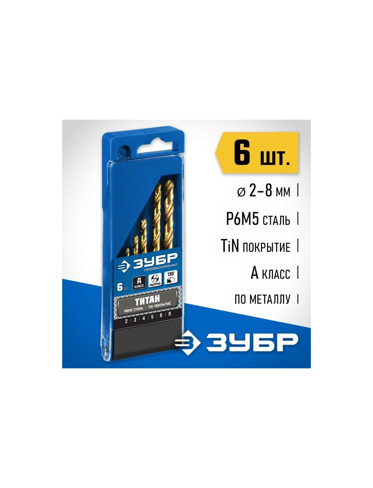 Набор сверл по металлу 2-8 мм (6 шт) Р6М5 титановое покрытие ЗУБР 29615-H6