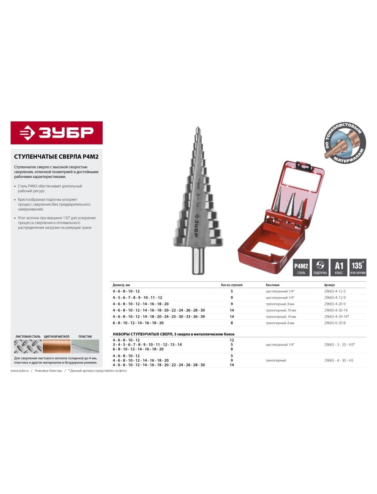 Набор ступенчатых сверл по металлу ЗУБР 29665-3-20-H3 предназначен для сверления металлических конструкций и заготовок, листовых материалов, цветных металлов, пластика. Множество диаметров в одном сверле для сверления различных листовых материалов. Крестообразная подточка позволяет начать сверление без предварительных работ. Угол заточки при вершине равный 135° для ускорения процесса сверления. Сверла изготовлены методом вышлифовки и соответствуют классу точности "А1"