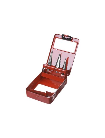 Набор ступенчатых сверл для получения отверстий различного диаметра без перестановки режущего инструмента. На каждой ступени есть маркировка фактического диаметра. Сверла изготовлены из быстрорежущей инструментальной стали. Количество ступенчатых сверл в наборе — 3 шт. Поставляется в металлическом боксе.