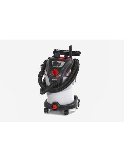 Корпус пылесоса выполнен из ударопрочного пластика. Пылесос оснащен системой циклон и надежным складчатым полиэстровым фильтром с площадью поверхности 3500 кв.см, максимально автоматизирован – оснащен розеткой для электроинструмента и автоматикой, которая активизирует пылесос в момент включения инструмента. Пылесос работает как с мешками, так и без мешков, собирая мусор в бак. Байпасная схема прохода воздуха позволяет производить как сухую, так и влажную уборку - убирать негорючие и неагрессивные жидкости и обеспечивает стабильное охлаждение двигателя. Пробка в нижней части бака дает возможность аккуратно слить собранную жидкость. Переключение в режим выдува позволяет убирать мусор с поверхностей без сбора его в бак.
