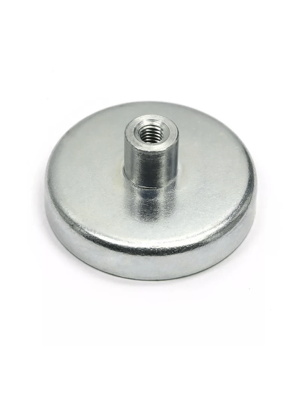 Магнитное крепление под болт D42 - это шайба из неодимового сплава, уложенная в стальной корпус, для защиты от ударов о твердую поверхность, чтобы магнит не потерял свои притягивающие свойства. На плоской стороне корпуса, точно по центру, сделан цилиндрический выступ, в котором нарезана внутренняя резьба, предназначенная для закручивания болта.