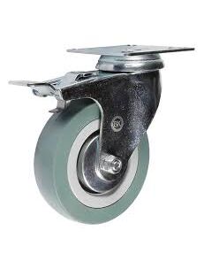 Колесные опоры аппаратные поворотные с тормозом, серая резина, полипропиленовый обод, платформенное крепление, подшипник скольжения