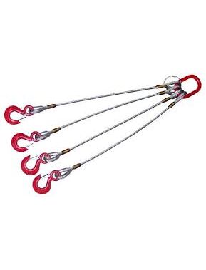 это канатное изделие с четырьмя ветвями, на концах которых сформированы проушины путем крепления металлической втулкой и механического соединения с применением стальных коушей, которые существенно увеличивают срок эксплуатации стропа, защищая канат в местах стыка и позволяют переносить серьезные нагрузки. Ветви скреплены между собой продолговатым ведущим звеном, а их концы укомплектованы прочными коваными крюками с затворами, которые обеспечивают дополнительную безопасность.