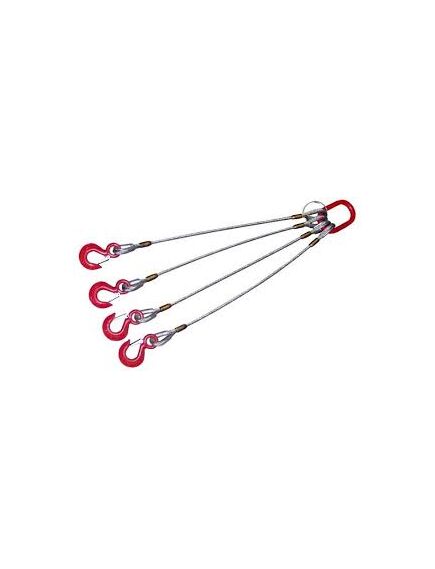это канатное изделие с четырьмя ветвями, на концах которых сформированы проушины путем крепления металлической втулкой и механического соединения с применением стальных коушей, которые существенно увеличивают срок эксплуатации стропа, защищая канат в местах стыка и позволяют переносить серьезные нагрузки. Ветви скреплены между собой продолговатым ведущим звеном, а их концы укомплектованы прочными коваными крюками с затворами, которые обеспечивают дополнительную безопасность.