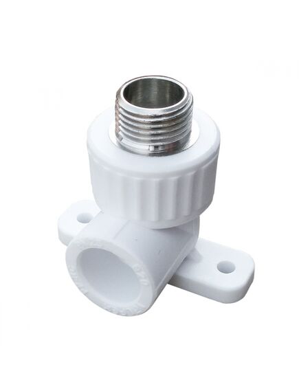 Комбинированный угловой фитинг с креплением, предназначенный для подсоединения к полипропиленовому трубопроводу сантехнического смесителя или другого компонента инженерной системы с резьбовым подключением.