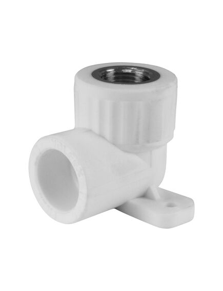 Комбинированный угловой фитинг с креплением, предназначенный для подсоединения к полипропиленовому трубопроводу сантехнического смесителя или другого компонента инженерной системы с резьбовым подключением.