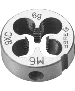 Круглая ручная плашка для нарезания метрической резьбы, мелкий шаг, М10x1,25 выполнена из легированной стали 9ХС. Сплав дополнен хромом, кремнием и углеродом для большей жесткости. Инструмент оснащен глубокими отводами для стружки, что сохраняет чистоту реза.