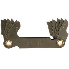 Шаблон для определения шага метрической резьбы STAYER PROFI 0,5-1,75 мм 28041 - приспособление, состоящее из 12 щупов, закрепленных в обойме. Шаг метрической резьбы: 0,5, 0,6, 0,7, 0,75, 0,8, 0,9, 1,0, 1,25, 1,5, 1,75 мм. Шаг трубной резьбы: 27, 28 TPI