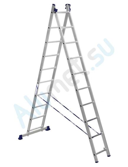 Серия профессиональных лестниц с более толстым и широким профилем для ежедневных работ на лестнице. Лестница может использоваться как раздвижная приставная лестница и как свободностоящая двухсторонняя стремянка.. Прочность конструкции в приставном виде обеспечивается необходимым перехлестом секций. От «расползания» лестницу в положении «двухсторонняя стремянка» удерживают страховочные ремни. Они же обеспечивают требуемый перехлест в положении «приставная лестница». Конструкция неразборная, поэтому отдельно пользоваться каждым из двух элементов лестницы невозможно. Тетива и ступени изготовлены из высокопрочного алюминиевого сплава, в соответствии с требованиями ГОСТ22233-2018.В верхней части лестницы расположен верхний соединительный узел. На узкой секции внизу расположены зацепы с предохранителем, с помощью которых осуществляется фиксация лестницы на нужной высоте. Шаг регулировки по высоте - 280 мм. На широкой секции внизу находится стабилизатор, который необходимо установить перед применением лестницы. Он придает лестнице дополнительную устойчивость. Внизу на секциях установлены массивные обрезиненные башмаки. На ступенях имеется рифление.