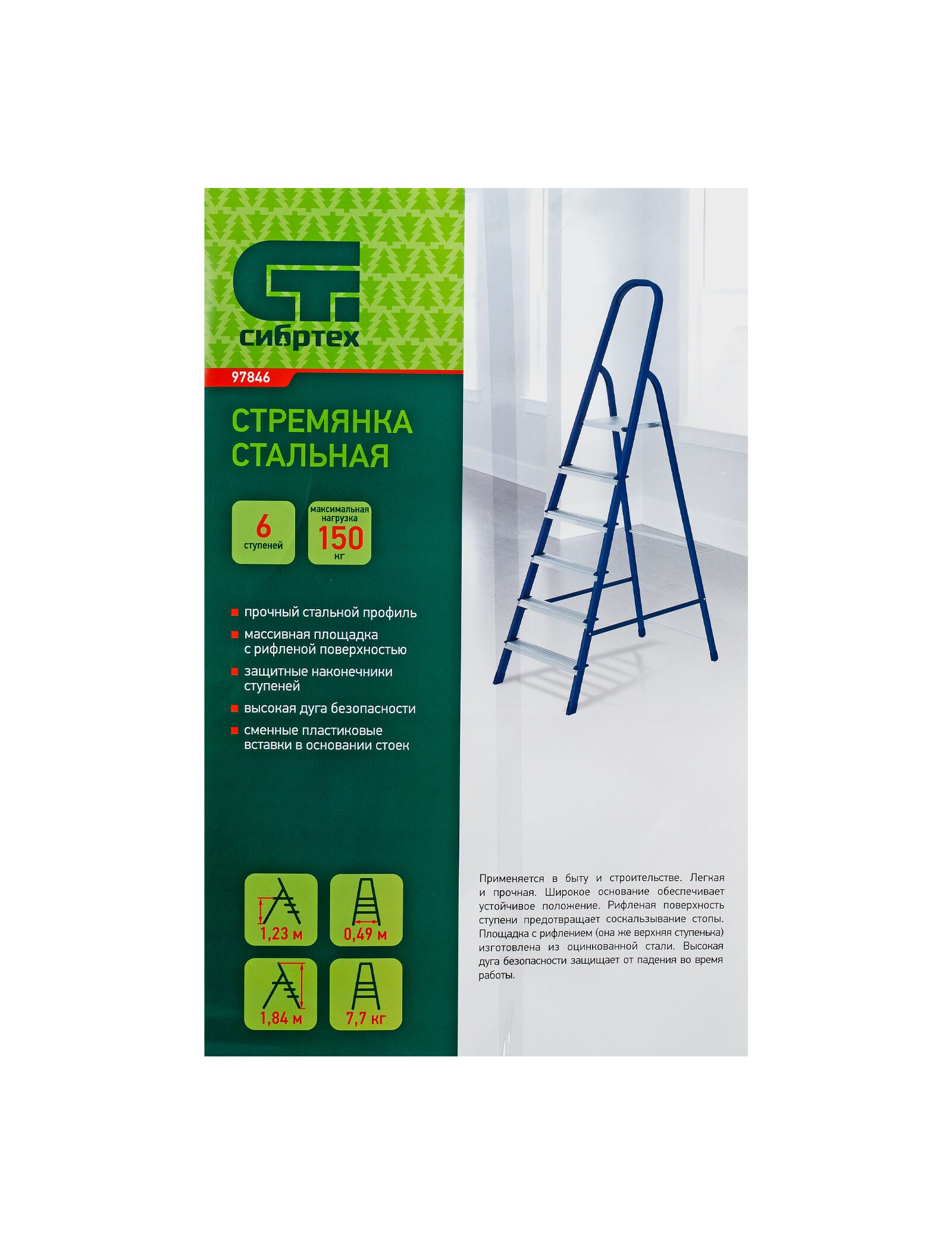 Стальная стремянка 6 ступеней СИБРТЕХ 97846 подходит для выполнения строительных и других работ на высоте. Используется в бытовых условиях. Устойчива к неблагоприятным внешним воздействиям. Имеет страховочные ленты для фиксации стремянки в рабочем положении.