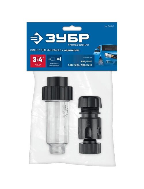 Входной фильтр для минимоек с адаптером 3/4 в комплекте ЗУБР 70402-2 применяется для очистки входной воды от механических примесей. Имеет быстросъемное соединение для стандартного подключения шлангов.