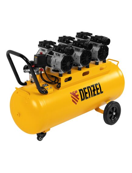 Безмасляный малошумный компрессор Denzel DLS 1800/100 58028 мощностью 1800 (3 х 600) Вт, объемом ресивера 100 л и производительностью 345 л/мин предназначен для обеспечения пневмоинструмента сжатым воздухом, подаваемым под давлением до 8 бар. Позволяет подключить пневматический заклепочник, дрель, шлифмашину и т. д. Оптимален для работы с краскопультом и для продувки электронных компонентов, т. к. в сжатом воздухе отсутствуют частицы масла. Компрессор пригодится в мастерской, гараже, на строительной площадке.