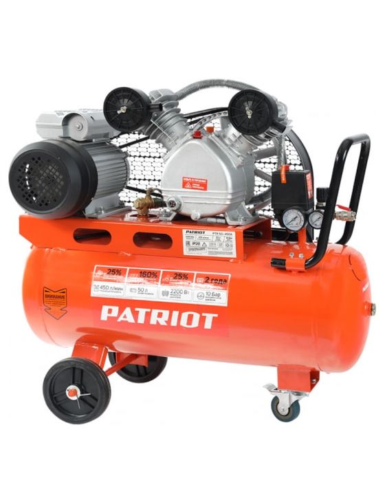 Компрессор PATRIOT PTR50/450A 525306325 имеет широкое применение в промышленности, строительстве и автосервисах. Агрегат производит 450 литров в минуту сжатого воздуха. Оснащен мощным двигателем с тепловой защитой от перегрева и автоматическим повторным пуском. Компрессор оснащен большим ресивером на 50 литров - для продолжительного рабочего цикла. При помощи специального клапана осуществляется слив конденсата из ресивера.