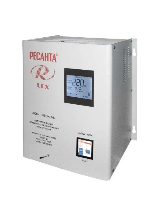 Однофазный стабилизатор напряжения Ресанта LUX АСН-10000Н/1Ц защищает бытовую технику от скачков напряжения, сетевых помех и короткого замыкания. Электромеханический релейный стабилизатор лучше всего подходит для ситуаций стабильно высокого или низкого напряжения.