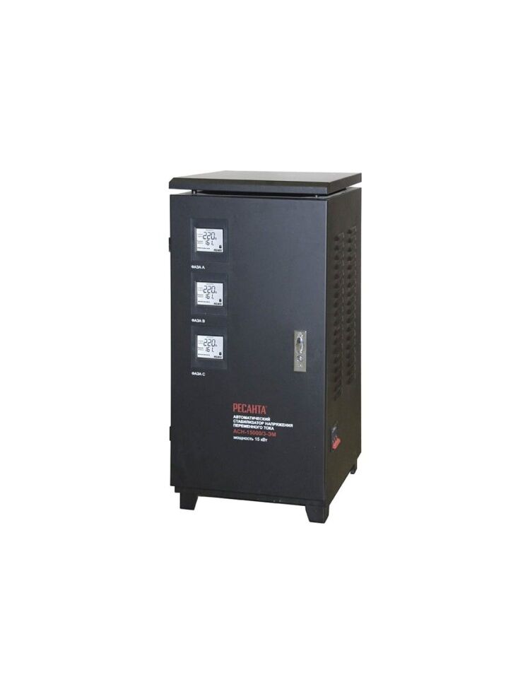 Трехфазный электромеханический стабилизатор напряжения Ресанта АСН-15000/3-ЭМ со встроенными фильтрами частотных помех, экраном, микропроцессорной системой управления и теплозащитой предназначен для корректировки входного напряжения и обеспечения стабильности работы электрооборудования мощностью до 15 кВт.